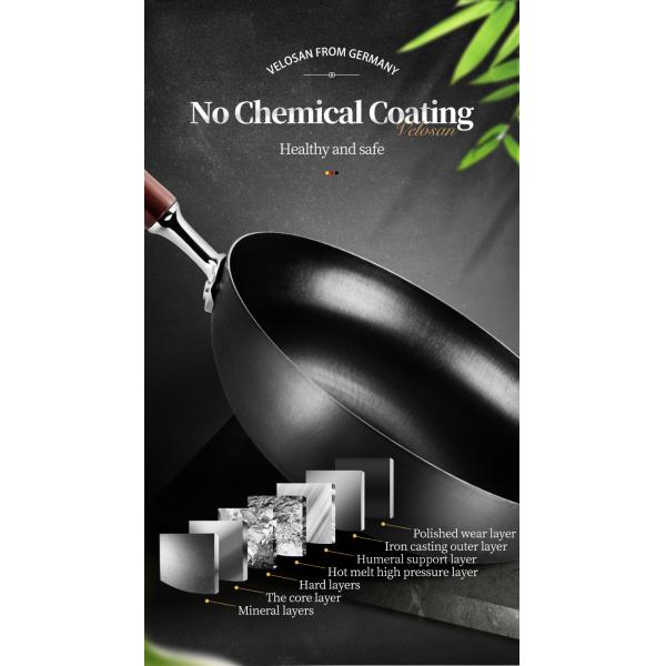 The wok is processed with double oxidizing and nitriding treatment, as well as three-time high-temperature smelting, polishing, and refining, which ensures outstanding durability, corrosion resistance, and high-temperature resistance.